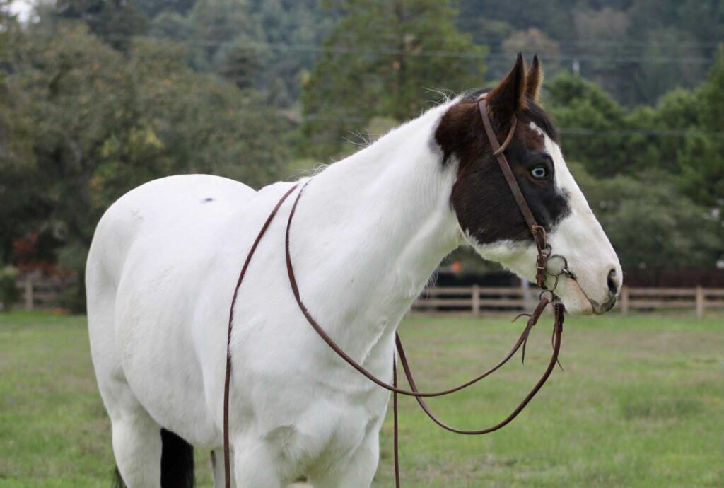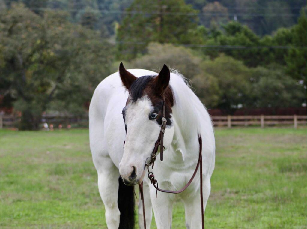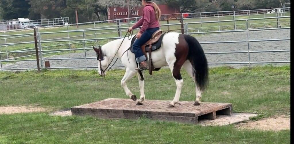 Bullet is a handsome 8-year-old, 14.2hh paint gelding with two striking blue eyes and an easygoing, willing personality. He is a joy to be around and very simple to handle, making him a pleasant and reliable partner for a variety of riders. Bullet has extensive experience on trails, roads, and in the arena. He excels on the trail and genuinely enjoys going on adventures. He travels confidently through steep, narrow terrain and moves with surefooted ease. He will lead the group without hesitation, ride calmly and consistently in the back, or go out alone with no issues. He is not buddy or barn sour and remains steady regardless of the situation. He also loves the water and will cross anything placed in front of him. Under saddle, Bullet has a natural low headset and is very easy to direct. He neck reins, responds well to leg cues, has a dependable stop, and catches both leads easily in the arena. He is soft, responsive, and comfortable to ride. Bullet is also good with time off and does not get fresh when brought back into work. He loads and hauls well and gets along nicely with other horses. With his temperament, trail experience, and solid training, Bullet would make an excellent horse for trail competitions or for anyone looking for a trustworthy, enjoyable partner both in and out of the arena.